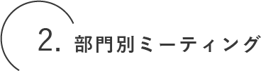 担当者とサポートメンバーが集まり議論を交わす場です。各部門の現状把握と問題解決策を導き出すことが目的です。この会議の最大の特徴は、希望者はだれでも参加できるところです。メンバーに選ばれていなくても、参加の意思があれば会議に加わり、視聴したり発言することができます。